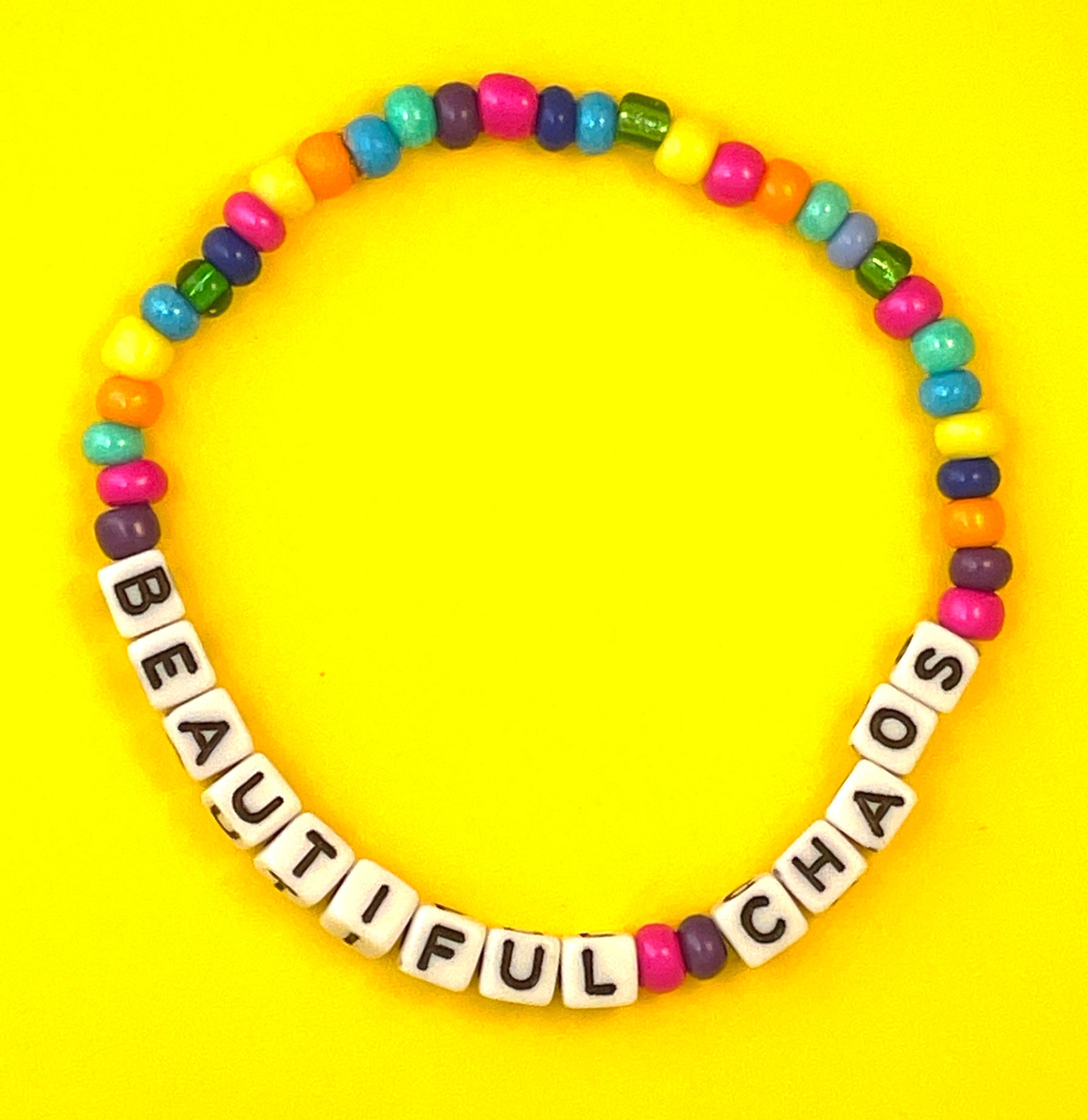 A fun bracelet with a whimsical twist! “Beautiful Chaos” reminds you that you can have your fun side and still have some chaos in your life’s- it’s still beautiful! … Sometimes sweet, sometimes sassy. . . Friendship bracelets are an updated way to remind yourself of important key words/concepts throughout your day with a quick look at your wrist.. Beads are strung on a strong, stretchy cord.