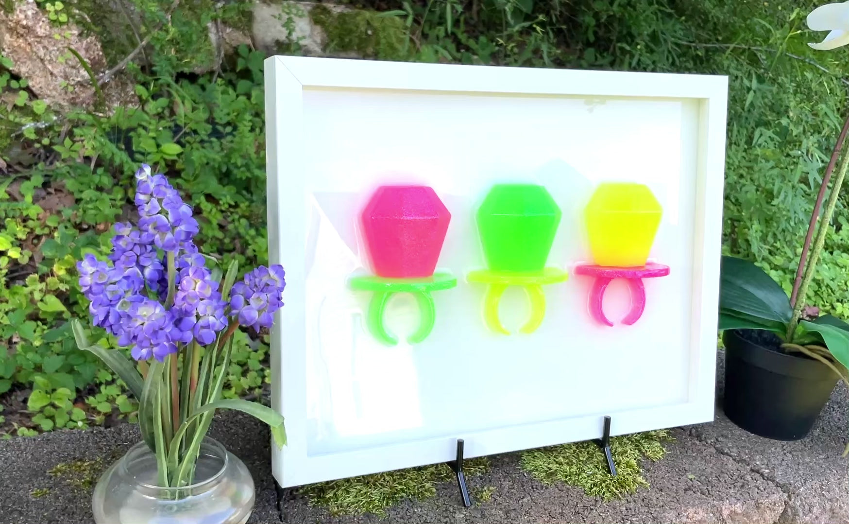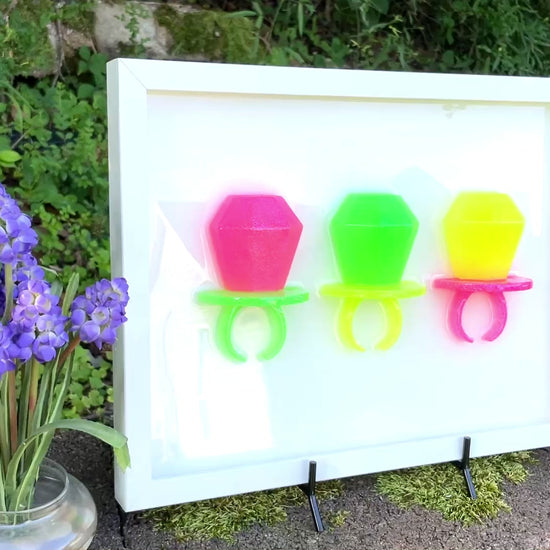 Add a touch of fun to your walls with our nostalgic Triple Ring Pop 3D Resin Framed Art. Made with resin and glitter, this unique wall art features a white frame and bold neon colors, bringing a playful touch to any room. It's a sweet treat for the eyes!