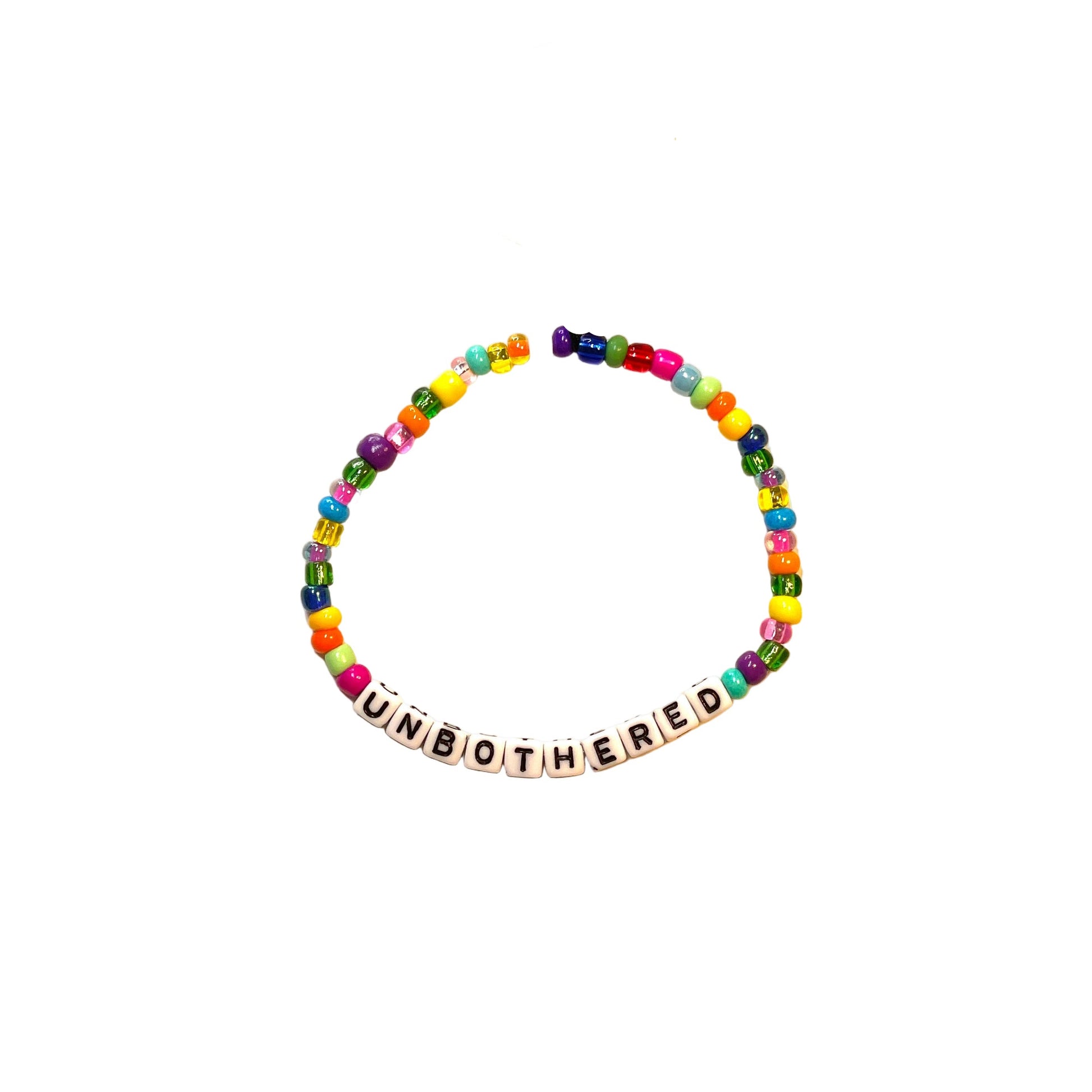 A fun bracelet with a whimsical twist! “Unbothered” reminds you, your posse/your thoughts to “not let the little things get to you” - to remain unbothered by all the minutia that creates “noise” in your day … Sometimes sweet, sometimes sassy. . . Friendship bracelets are an updated way to remind yourself of important key words/concepts throughout your day with a quick look at your wrist.. Beads are strung on a strong, stretchy cord.
